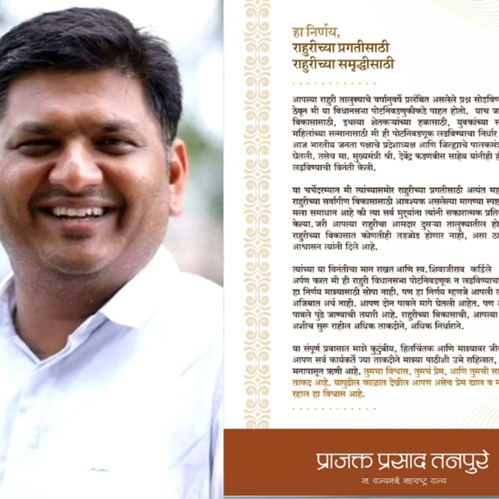 राज्यातील बारामती आणि राहुरी विधानसभा पोटनिवडणुकीच्या निमित्ताने राजकीय वातावरण कमालीचे तापले असतानाच, आज अर्ज भरण्याच्या शेवटच्या दिवशी राहुरीत अत्यंत नाट्यमय घडामोडी पाहायला मिळाल्या. प्रबळ दावेदार मानले जाणारे प्राजक्त तनपुरे यांनी ऐनवेळी निवडणुकीतून माघार घेण्याचा निर्णय घेतल्याने राजकीय वर्तुळात चर्चांना उधाण आले आहे. प्राजक्त तनपुरे यांनी सोशल मीडियावर एक पत्र शेअर करत, राहुरी पोटनिवडणुकीतून माघार घेण्यामागचे कारणही सांगितले. दिवंगत आमदार शिवाजीराव कर्डिले यांच्या निधनामुळे रिक्त झालेल्या या जागेवर त्यांचे पुत्र अक्षय कर्डिले यांना भाजपने उमेदवारी जाहीर केली आहे. त्यांच्या विरोधात अपक्ष म्हणून प्राजक्त तनपुरे शड्डू ठोकणार, अशी जोरदार चर्चा होती. तनपुरे यांनी या निवडणुकीसाठी मोठी तयारीही केली होती, ज्यामुळे राहुरीत चुरशीची लढत पाहायला मिळेल, अशी सर्वांची धारणा होती. फडणवीसांचा फोन आणि तनपुरेंची माघार उमेदवारी अर्ज दाखल करण्याची मुदत संपायला काही अवधी उरला असतानाच, भाजपचे प्रदेशाध्यक्ष रवींद्र चव्हाण आणि अहिल्यानगरचे पालकमंत्री राधाकृष्ण विखे पाटील यांनी तातडीने प्राजक्त तनपुरे यांची भेट घेतली. या नेत्यांमध्ये बराच वेळ बंद दाराआड खलबते झाली. विशेष म्हणजे, या चर्चेदरम्यान मुख्यमंत्री देवेंद्र फडणवीस यांनी स्वतः फोनवरून तनपुरे यांच्याशी संवाद साधला. मुख्यमंत्र्यांनी केलेल्या आवाहनानंतर आणि भाजप नेत्यांच्या शिष्टाईनंतर तनपुरे यांनी आपला पवित्रा बदलला आणि निवडणुकीतून माघार घेण्याचे निश्चित केले. प्राजक्त तनपुरेंनी फेसबुकवरील पत्रात काय म्हटले? निवडणुकीतून माघार घेतल्यानंतर प्राजक्त तनपुरे यांनी फेसबुकवर एक सविस्तर पत्र पोस्ट करत, निवडणुकीतून माघार घेण्यामागचे कारण सांगितले. प्राजक्त तनपुरे पत्रात लिहिले की, “आपल्या राहुरी तालुक्याचे वर्षानुवर्षे प्रलंबित असलेले प्रश्न सोडवण्याचा ध्यास मनात ठेवून मी या विधानसभा पोटनिवडणुकीकडे पाहत होतो. याच जाणिवेतून राहुरीच्या विकासासाठी, इथल्या शेतकऱ्यांच्या हक्कासाठी, युवकांच्या स्वप्नांसाठी आणि महिलांच्या सन्मानासाठी मी ही पोटनिवडणूक लढविण्याचा निर्धार केला होता. परंतु, आज भारतीय जनता पक्षाचे प्रदेशाध्यक्ष आणि जिल्ह्याचे पालकमंत्री यांनी माझी भेट घेतली. तसेच मुख्यमंत्री देवेंद्र फडणवीस यांनीही ही पोटनिवडणूक न लढवण्याची विनंती केली. या चर्चेदरम्यान मी त्यांच्यासमोर राहुरीच्या प्रगतीसाठी अत्यंत महत्त्वाचे मुद्दे मांडले. राहुरीच्या सर्वांगीण विकासासाठी आवश्यक असलेल्या मागण्या स्पष्टपणे मांडल्या आणि मला समाधान आहे की त्या सर्व मुद्यांना त्यांन
