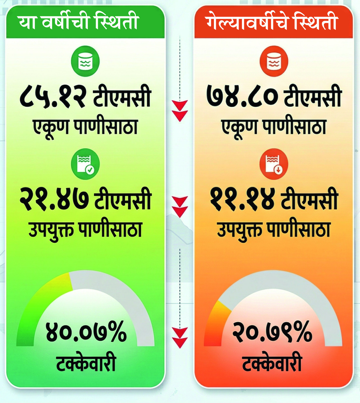 दि. ६ एप्रिल २०२५ रोजी मागील वर्षी याच दिवशी एकूण साठा ७४.८० टीएमसी तर उपयुक्त साठा ११.१४ टीएमसी (२०.७९ टक्के) होता. चालू वर्षी झालेला मुबलक पावसामुळे यंदा पाण्याची स्थिती समाधानकारक आहे. कालवा आणि इतर सिंचन योजनेतून पाण्याचे आतापर्यंत आवर्तन सुरू आहे.