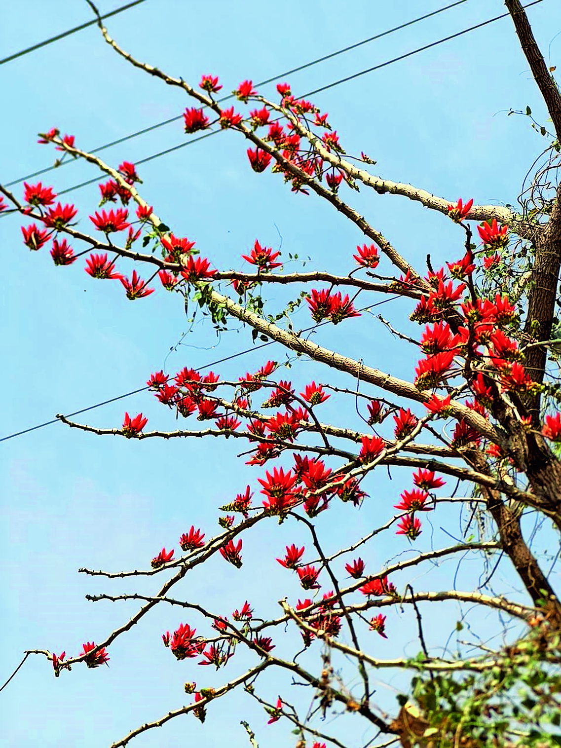 मंगरूळ फाट्यावर बूच पांगारा फुलला आहे. लाल-भगव्या मखमली फुलांनी झाड सजले आहे. पळस आणि पांगारा भावकीची झाडे आहेत. आधी पळस लाल भडक रंगात फुलतो. या फुलांना सुगंध नाही. निसर्गाने ही उणीव रंगात, मकरंदात भरून काढली आहे.