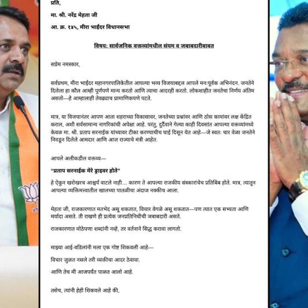 काशीगाव मेट्रो परिसरातील सुमारे ३० टक्के जमिनीच्या वादावरून मिरा-भाईंदरच्या राजकारणात नवा संघर्ष पेटला आहे. परिवहन मंत्री प्रताप सरनाईक यांनी या भागातील मोठ्या जमिनी आमदार नरेंद्र मेहता यांच्या मालकीच्या असल्याचा दावा केल्यानंतर वादाला सुरुवात झाली. मात्र, या प्रकरणाने आता वैयक्तिक आरोप-प्रत्यारोपांचे रूप धारण केले असून दोन्ही बाजूंनी तीव्र प्रतिक्रिया उमटत आहेत. या पार्श्वभूमीवर आमदार नरेंद्र मेहता यांनी माध्यमांशी बोलताना प्रताप सरनाईक यांच्यावर जोरदार टीका केली. जर माझ्याकडे 30 टक्के जमीन असती, तर सरनाईक मला दूरून बोलावले असते. इतकेच नव्हे तर ते माझे ड्रायव्हर झाले असते, असे वादग्रस्त वक्तव्य मेहता यांनी केले. त्यांच्या या विधानामुळे राजकीय वातावरण अधिक तापले असून या वक्तव्यावरून जोरदार चर्चा रंगली आहे. या वक्तव्याचा निषेध करत परिवहन मंत्री प्रताप सरनाईक यांचे पुत्र पूर्वेश सरनाईक यांनी नरेंद्र मेहता यांना उद्देशून एक पत्र लिहले आहे. या पत्रात त्यांनी मेहता यांच्या वक्तव्याला अत्यंत आक्षेपार्ह आणि खालच्या पातळीचे संबोधले आहे. राजकारणात मतभेद असू शकतात, परंतु व्यक्तीगत पातळीवर टीका करताना मर्यादा पाळणे गरजेचे असल्याचे त्यांनी स्पष्ट केले आहे. पूर्वेश सरनाईक यांनी पत्रात पुढे नमूद केले की, जनतेने दिलेल्या कौलानंतर लोकप्रतिनिधींनी विकासकामांवर लक्ष केंद्रित करणे अपेक्षित आहे. चार वेळा निवडून आलेल्या आमदाराबाबत आणि सध्याच्या मंत्र्यांबाबत अशा प्रकारची भाषा वापरणे ही राजकीय संस्कृतीला शोभणारी नाही. राजकारण हे केवळ वक्तव्ये करण्यासाठी नसून ते संस्कार आणि जबाबदारीची गोष्ट आहे, असे सांगत त्यांनी सभ्यतेचे भान राखण्याचे आवाहन केले. या संपूर्ण वादामुळे मिरा-भाईंदरमधील राजकीय वातावरण चांगलेच ढवळून निघाले आहे. शिवसेना कार्यकर्त्यांमध्येही या प्रकरणावरून संताप व्यक्त होत असून कार्यकर्ते आक्रमक झाले आहेत. या पार्श्वभूमीवर शिवसेना विधानसभा प्रमुख सचिन मांजरेकर यांनी प्रतिक्रिया देताना, आमचा नेता संयमी आहे, त्यामुळे आम्हीही संयम पाळतो, असा टोला लगावला. तसेच आवश्यक असल्यास उत्तर देण्याची ताकद आमच्यात आहे, असेही त्यांनी स्पष्ट केले. राजकीय संघर्ष अधिक तीव्र होण्याची शक्यता दरम्यान, काशीगाव मेट्रो परिसरातील जमीन वादातून सुरू झालेला हा संघर्ष आता वैयक्तिक पातळीवर पोहोचल्याने आगामी काळात राजकीय संघर्ष अधिक तीव्र होण्याची शक्यता व्यक्त केली जात आहे. विकासाच्या मुद्द्यांवर चर्चा होण्याऐवजी आरोप-प्रत्यारोप सुरू असल्याने नागरिकांमध्येही नाराजी व्यक्त होत आहे. त्यामुळे हा वाद नेमका कोणत्या दिशेने वळणार, याकडे सर्वांचे लक