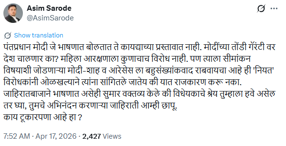 असीम सरोदे म्हणाले, पंतप्रधान मोदी जे भाषणात बोलतात ते कायद्याच्या प्रस्तावात नाही. मोदींच्या तोंडी गॅरंटी वर देश चालणार का? महिला आरक्षणाला कुणाचाच विरोध नाही. पण त्याला सीमांकन विषयाशी जोडणाऱ्या मोदी-शाह व आरेसेस ला बहुसंख्यांकवाद राबवायचा आहे ही ‘नियत’ विरोधकांनी ओळखल्याने त्यांना सांगितले जातेय की यात राजकारण करू नका.
