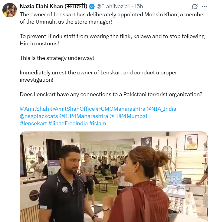 यानंतर नाझिया खान यांनी स्टोअरमधील कर्मचाऱ्यांच्या कपाळावर भगवा टिळा लावला. यावेळी नाझिया खान यांच्यासोबत आलेल्या कार्यकर्त्यांनी ‘जय श्री राम’ आणि ‘हर हर महादेव’च्या घोषणाही दिल्या. “हिंदू रीतिरिवाजांचे दमन करणाऱ्या धोरणांना आम्ही खपवून घेणार नाही,” असे त्यांनी ठणकावून सांगितले. दरम्यान, नाझिया खान यांनी लेन्सकार्टच्या कोणत्या शोरूममध्ये निदर्शन केले हे समजू शकले नाही.