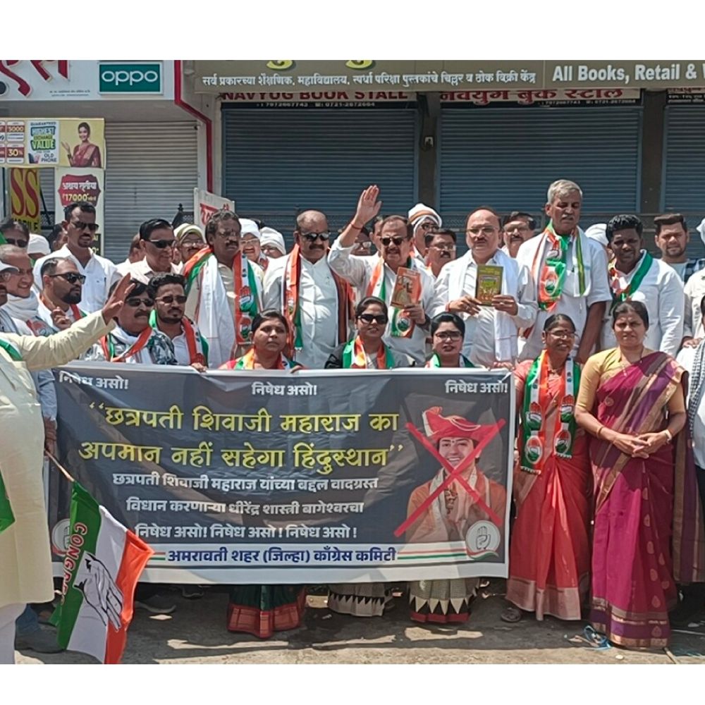 हिंदवी स्वराज्याचे संस्थापक छत्रपती शिवाजी महाराज यांच्याबद्दल अवमानजनक टिप्पणी केल्याप्रकरणी बागेश्वर धाम येथील धीरेंद्र शास्त्री यांच्याविरोधात अमरावतीत काँग्रेसने तीव्र निदर्शने केली. रविवार, २६ एप्रिल रोजी राजकमल चौकात हे आंदोलन करण्यात आले, ज्यामुळे परिसर घोषणांनी दणाणून गेला होता. काँग्रेसचे प्रांताध्यक्ष हर्षवर्धन सपकाळ यांच्या निर्देशानुसार हे आंदोलन आयोजित करण्यात आले होते. माजी पालकमंत्री डॉ. सुनील देशमुख, माजी महापौर मिलींद चिमोटे आणि शहराध्यक्ष बबलू शेखावत यांनी या आंदोलनाचे नेतृत्व केले. यावेळी धीरेंद्र शास्त्री उर्फ बागेश्वर बाबा यांच्याविरोधात गुन्हा दाखल करावा आणि त्यांना महाराष्ट्रात येण्यास बंदी घालावी, अशी मागणी करण्यात आली. आंदोलनकर्त्यांनी सांगितले की, छत्रपती शिवाजी महाराज हे महाराष्ट्राचे आराध्य दैवत आहेत आणि त्यांचा अपमान कोणताही शिवप्रेमी सहन करणार नाही. धीरेंद्र शास्त्री यांनी एका कार्यक्रमात इतिहासाची मोडतोड करून छत्रपती शिवाजी महाराजांबद्दल अत्यंत चुकीचे वक्तव्य करून त्यांचा अपमान केला आहे. ही बाब अत्यंत निंदनीय असल्याचे काँग्रेसजनांनी म्हटले. महत्वाचे म्हणजे, धीरेंद्र शास्त्री यांनी ज्या कार्यक्रमात हे अवमानजनक वक्तव्य केले, त्या कार्यक्रमाला भाजप आणि राष्ट्रीय स्वयंसेवक संघाचे पदाधिकारीही उपस्थित होते. त्यामुळे आंदोलनकर्त्यांनी भाजप आणि संघाचाही निषेध केला. यावेळी “छत्रपती शिवाजी महाराज की जय”, “छत्रपती शिवाजी महाराज के सन्मान में काँग्रेस पार्टी मैदान में”, “छत्रपती शिवाजी महाराज का अपमान नहीं सहेगा हिंदुस्थान” अशा घोषणांनी राजकमल चौक दुमदुमून गेला. या आंदोलनात मनपा विरोधी पक्षनेते विलास इंगोले, अशोक डोंगरे, स्वीकृत नगरसेवक अनिल अग्रवाल, महिला काँग्रेसच्या अध्यक्ष जयश्री वानखडे, नितीन काळे, निलेश गुहे, संकेत कुलट, विनोद मोदी, हाजी नजीर खान बी.के., नगरसेवक विक्की वानखडे, प्रा. संजय शिरभाते, नगरसेविका अर्चना आत्राम, सुनीता भेले, राजश्री जढाळे, मैथिली पाटील, वंदना निरगुडे, किरण चांदवडकर, सलीमभाई मिरावाले, दीपक हुंडीकर, मनोज भेले, प्रभाकर वाळसे, सुरेश रतावा, विजय वानखडे, जितेंद्र वाघ, अनिल तायडे, गजानन रडके, युवक काँग्रेसचे अनिकेत ढेंगळे यांच्यासह महिला काँग्रेस, युवक काँग्रेस, सेवादल, एन.एस.यु.आय, इंटक आणि काँग्रेसच्या विविध सेलचे पदाधिकारी व कार्यकर्ते मोठ्या संख्येने सहभागी झाले होते.