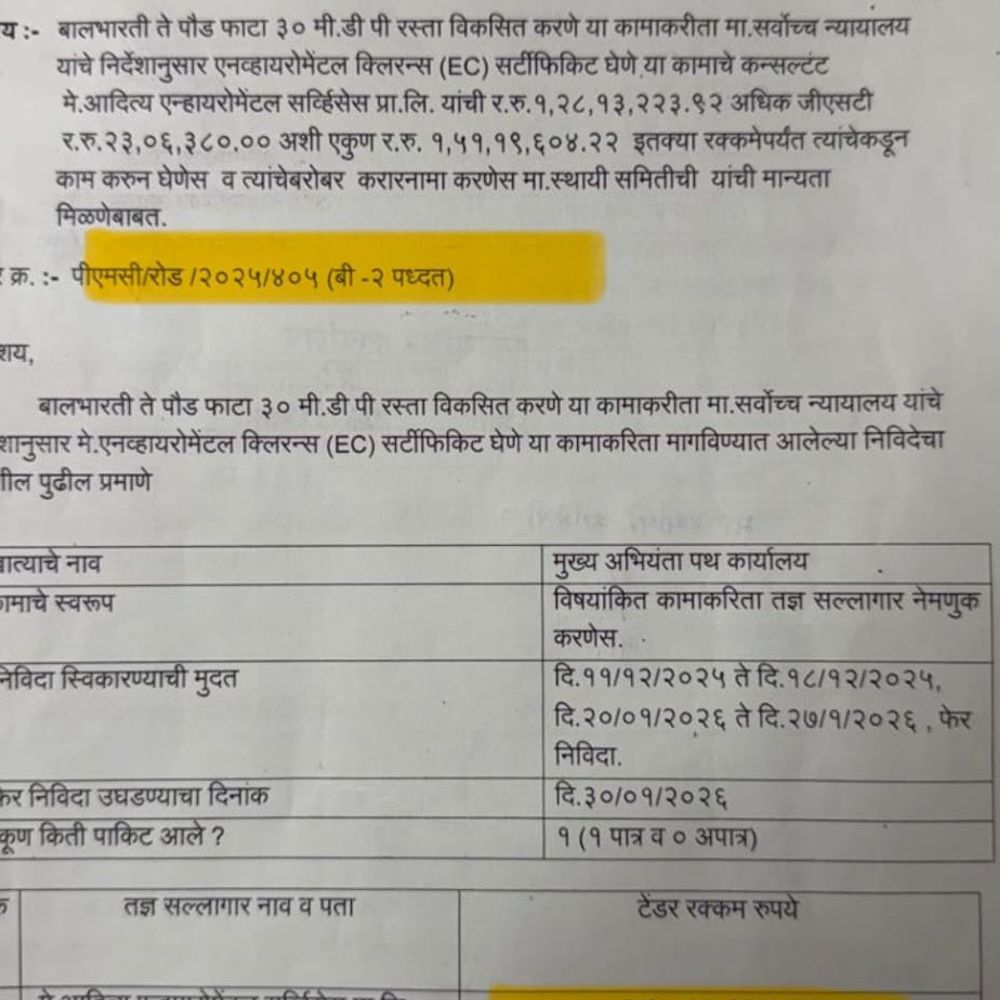 पुणे महानगरपालिकेच्या बालभारती ते पौड फाटा ३० मीटर डी.पी. रस्ता विकास कामाच्या पर्यावरणीय परवानगी प्रक्रियेतील निविदेत मोठ्या आर्थिक अनियमिततेचा आरोप करण्यात आला आहे. या कामासाठी ‘आदित्य एन्व्हायर्नमेंटल सर्व्हिसेस प्रा. लि.’ या कंपनीने ३४.६५ लाख रुपयांची सर्वात कमी निविदा सादर केली होती. मात्र, स्थायी समितीसमोर मंजुरीसाठी ठेवण्यात आलेल्या प्रस्तावात हीच रक्कम १.५१ कोटी रुपये (१.२८ कोटी + जीएसटी) इतकी दाखवण्यात आली आहे. यामुळे एकाच कामासाठी कोणताही ठोस आधार नसताना निविदेच्या रकमेत जवळपास चारपट वाढ करण्यात आल्याचे समोर आले आहे. ही केवळ प्रशासकीय चूक नसून जनतेच्या पैशांची उघड लूट असल्याचा गंभीर संशय व्यक्त होत आहे. विशेष म्हणजे, पहिल्या निविदेला प्रतिसाद न मिळाल्याने पुन्हा निविदा काढण्यात आली होती आणि त्यात केवळ एकच निविदा प्राप्त झाली असतानाही ही अवाढव्य रक्कम वाढवण्यात आली. या प्रकरणावर महाराष्ट्र प्रदेश युवक काँग्रेसच्या प्रसारमाध्यम विभागाचे अध्यक्ष अक्षय जैन यांनी तीव्र टीका केली आहे. ते म्हणाले की, “निविदा एक आणि रक्कम चारपट, हा पुणे महापालिकेचा नवा ‘मॉडेल’ आहे का? गेल्या काही दिवसांत महापालिकेच्या निर्णयात पारदर्शकतेचा अभाव दिसत असून, विकासाऐवजी केवळ ठेकेदारांना फायदा करून देण्याचे काम सुरू आहे.” जैन यांनी पुढे म्हटले की, ३४ लाखांच्या निविदेवर १.५१ कोटींची मंजुरी ही केवळ त्रुटी नसून सिस्टिमॅटिक गैरव्यवहार करून काहींचे खिसे भरण्याचा प्रकार आहे. या पार्श्वभूमीवर, या संपूर्ण प्रकरणाची उच्चस्तरीय व स्वतंत्र चौकशी करण्याची मागणी प्रशासनाकडे करण्यात आली आहे. तसेच, निविदा रक्कम व मंजुरी रक्कम यातील तफावत स्पष्ट होईपर्यंत संबंधित आर्थिक व्यवहार स्थगित करावेत आणि जबाबदार अधिकाऱ्यांवर कठोर कारवाई करावी, अशी मागणीही त्यांनी केली. पुणेकरांच्या करातून उभ्या राहणाऱ्या निधीचा असा गैरवापर होऊ देणार नाही, असा इशाराही यावेळी देण्यात आला.