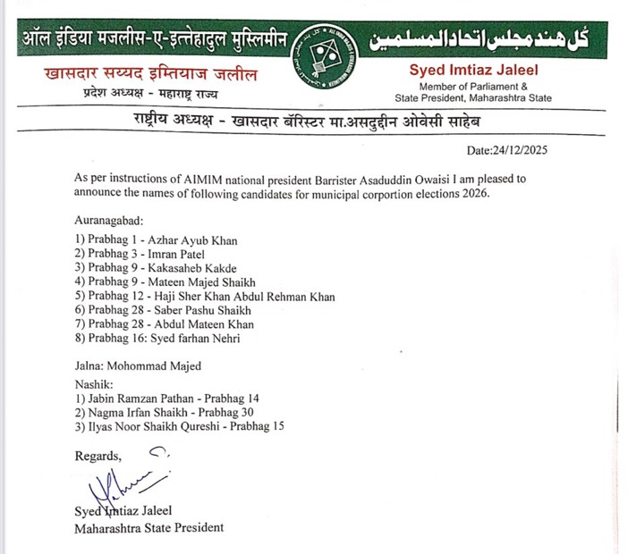 इम्तियाज जलील यांनी जाहीर केलेल्या पहिल्या यादीत छत्रपती संभाजीनगरमधील विविध प्रभागांतील 8 उमेदवारांचा समावेश आहे. याशिवाय जालन्यातील 1 आणि नाशिकमधील 3 उमेदवारांची नावेही घोषित करण्यात आली आहेत. इतर मोठ्या पक्षांची युती आणि जागावाटपाची गणिते अद्याप सुटलेली नसताना एमआयएमने घेतलेली ही झेप आगामी निवडणुकीत चुरस वाढवणारी ठरणार आहे.