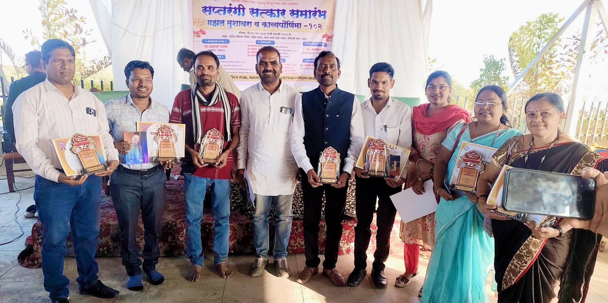 येथील सप्तरंगी साहित्य मंडळाच्या वतीने शहरातील हाॅटेल विसावा पॅलेस येथे साहित्य क्षेत्रातील पुरस्कार मिळालेल्या साहित्यिकांचा सत्कार समारंभ आयोजित करण्यात आला होता. त्यांच्या सन्मानार्थ कथाकथन, काव्यपौर्णिमा-१०२ आणि गझल मुशायराचे आयोजन करण्यात आले होते. यात चंद्रकांत कदम ( सन्मित्र), सय्यद चाँद तरोडकर, डॉ. स्वाती भद्रे-आकुसकर, दीपाली कुलकर्णी, अंजली मुनेश्वर, विजय वाठोरे, विजय धोबे, कपिल सावळेश्वरकर, शंकर माने, सुनिता डरंगे यांनी सहभाग घेतला. हरेक मतला आणि शेरांवर टाळ्यांचा गजर झाला. समाजातील कुप्रवृत्ती, दांभिकता, विडंबन, वितुष्ट यांना झोडपून काढीत एकमेकांत सौहार्द, जिव्हाळा, प्रेम, ऐक्य, सुसंवाद प्रस्थापित करणाऱ्या गझलांचे सादरीकरण करून वातावरण मंत्रमुग्ध केले. सूत्रसंचालन सन्मित्र चंद्रकांत कदम यांनी केले तर आभार नागोराव डोंगरे यांनी मानले.