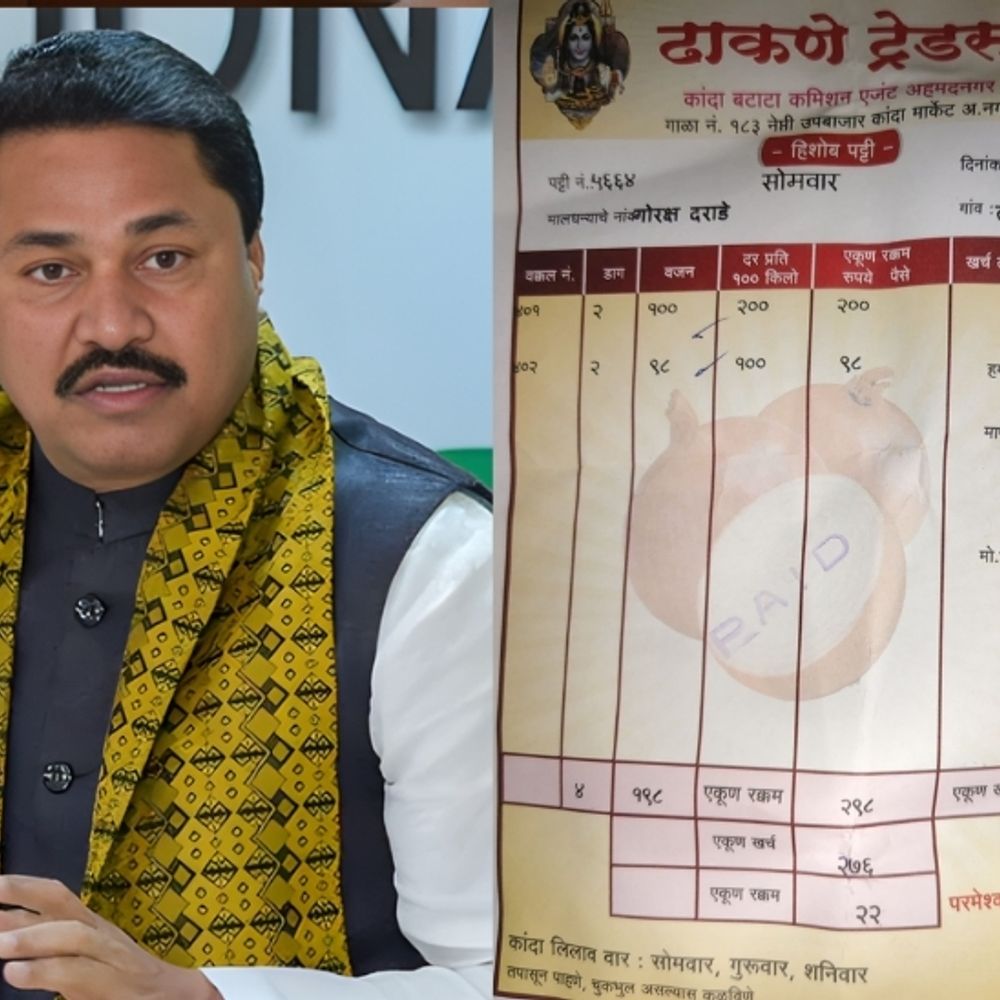 अहिल्यानगर जिल्ह्यातील लाडजळगाव येथील गोरक्ष दराडे या शेतकऱ्याच्या हिशोबाची पावती नाना पटोले यांनी सोशल मीडियावर शेअर केली आहे. शेतकऱ्याने 198 किलो कांदा विकला. त्याचे त्याला 298 रुपये मिळाले. वाहतूक, मजुरी आणि इतर खर्च वजा जाता शेतकऱ्याच्या हातात केवळ 22 रुपये पडले.