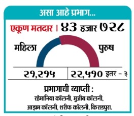 वॉर्ड क्र. उमेदवार, पक्ष मतदान ४१ इर्शाद खान, एमआयएम ३,१७९ ४२ नसीम बी सांडू, एमआयएम ३,९५१ ४३ अजीम अहमद – अपक्ष २,३३६ प्रभाग आरक्षण : अ- ओबीसी महिला, ब- सर्वसाधारण महिला, क- सर्वसाधारण, ड- सर्वसाधारण