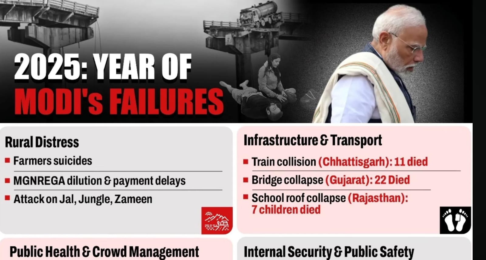 २०२५ मध्ये देशात एकामागून एक दुर्घटना घडल्या रेल्वे अपघात, पूल कोसळणे, मोठे औद्योगिक अपघात. प्रयागराज कुंभमेळ्यात मृत्यू झाले, पण आजही नेमका आकडा जनतेला माहित नाही. २९ जानेवारी २०२५ रोजी ३० भाविकांचा मृत्यू झाला, पण आजपर्यंत नुकसानभरपाईचा ठोस हिशेब नाही.पहलगाम येथे पर्यटकांची निर्घृण हत्या झाली सुरक्षा अपयश स्पष्ट असूनही जबाबदारी कोणाची, याचं उत्तर नाही. जम्मू-काश्मीर केंद्रशासित प्रदेश आहे, दिल्ली पोलीस केंद्राच्या अखत्यारीत आहे मग अपयशाची जबाबदारी कुणाची?