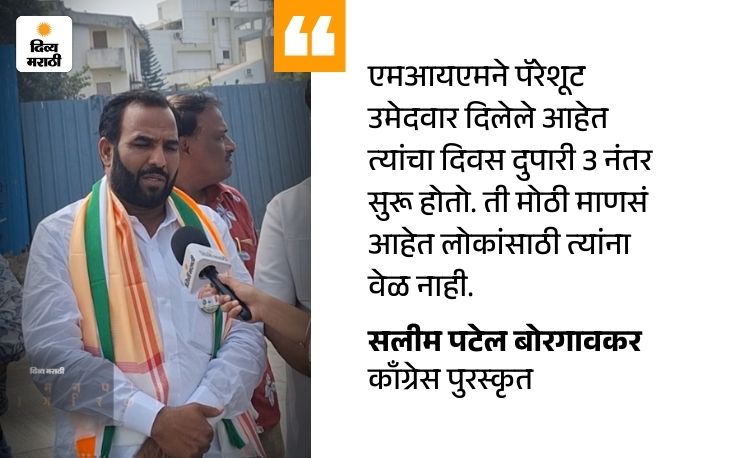 काँग्रेस पुरस्कृत उमेदवार सलीम पटेल बोरगावकर म्हणाले की, आम्ही सकाळी सहा वाजेपासून लोकांसाठी उपलब्ध असतो. एमआयएमने पॅरेशूट उमेदवार दिलेले आहेत त्यांचा दिवस दुपारी 3 नंतर सुरू होतो. ती मोठी माणसं आहेत लोकांसाठी त्यांना वेळ नाही. आमच्या प्रभागात सर्वांत मोठी समस्या ही पाण्याची आहे. ड्रेनेजची एक मोठी समस्या आमच्या प्रभागात दिसून येते. त्याकडे लक्ष दिले पाहिजे. आम्ही पाण्यासाठी आंदोलक केले आहेत, पाण्याची लाइन टाकण्याचे काम केले आहे.ड्रेनेज लाइन टाकण्याचे काम, आणि रस्ते ही सर्व कामे केली आहेत, त्या केलेल्या कामावर मी निवडणुकीला सामोरे जाणार आहे. आमच्या परिसरात पाण्याची लाईन झालेली नाही, ती लाइन बदलणे हे सर्वांत महत्त्वाचे काम आहे. आमच्याकडे पॅरेशूट उमेदवार लादण्यात आलेला आहे. त्यांना आमच्या परिसरातील नागरिकांच्या समस्या काय समजतील. बाहेरील उमेदवार लोकांना खोटी आश्वासने देत आहेत. आम्ही स्थानिक उमेदवार आहोत. जनतेला सर्व काही माहिती आहे, ते त्यांना साथ देणार नाहीत. आम्ही प्रभागातील दुषित पाण्याचा विषय मार्गी लावणार आहोत.