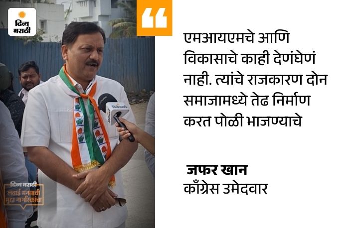 काँग्रेसचे उमेदवार जफर खान म्हणाले की, एमआयएमचे आणि विकासाचे काही देणंघेणं नाही. त्यांचे राजकारण दोन समाजामध्ये तेढ निर्माण करत पोळी भाजण्याचे आहे. आम्ही मात्र सर्वांना सोबत घेऊन काम करत असतो. आम्ही विकासाच्या मुद्द्यासाठी काम करत असतो त्यांना यासाठी काहीच काम करायचे नाही. ते व्हिजन विकास या सर्व गोष्टीपासून दूर आहेत, त्यामुळे काही बोलण्यासारखे त्यांच्याकडे नसल्याने ते कार्यक्रमाला आले नाहीत. आम्ही प्रामुख्याने लोकांना पाणी लवकर मिळवून देण्यासाठी प्रयत्नशील राहणार आहोत. कचऱ्याचा विषय मार्गी लावणार आहोत. तर ड्रेनेजचे पाणी हे पिण्याच्या पाण्यात मिक्स होत आहे त्याकडे आम्ही लक्ष घालणार आहोत.आमच्या संजयनगर-बायजीपुरा हा वॉर्ड असताना मी या परिसराचे नेतृत्व केलेले आहे. मनपामध्ये विरोधी पक्षनेतेपदावर काम केले आहे. यावेळी आम्ही चौथ्या दिवशी नागरिकांना पाणी देत होतो त्यावेळेस जायकवाडीमध्ये पाणी सुद्धा नव्हते. पण आज धरण पूर्ण भरलेले असताना पाणी 10 ते 12 दिवसांनी येते असे का होत आहे हे समजत नाही. आमच्या प्रभागात कचऱ्याचा मोठा विषय आहे. अनेक ठिकाणी कचरा साचलेला असतो, तो साफ केला जात नाही.आमच्या कार्यकाळात ही समस्या नव्हती. कारण आम्ही मनपाच्या कर्मचाऱ्यांकडून कामे करुण घेत होतो. भूमिगत गटार योजना आणत आम्ही विकास करण्याचा प्रयत्न केला. आमची सत्ता असताना पथदिवे लावले. पण आजचे सत्ताधारी नेते काहीच करत नाही, जनतेबद्दल त्यांना काहीच तळमळ दिसून येत नाही. जे होतंय ते होऊ द्या अशी सत्ताधारी आणि विरोधकांचे सुरू आहे. काँग्रेस-राष्ट्रवादीच्या काळात काही कामे झाले नाही असे म्हणायचा विषयच नाही, कारण आम्ही जवळपास 450 कोटी रुपयांचे कामे केली आहेत. आमच्यावर राष्ट्रवादीचे नेते आरोप करत असतील तर त्यांचे ज्ञान कमी आहे असा टोला जफर खान यांनी लगावला आहे.