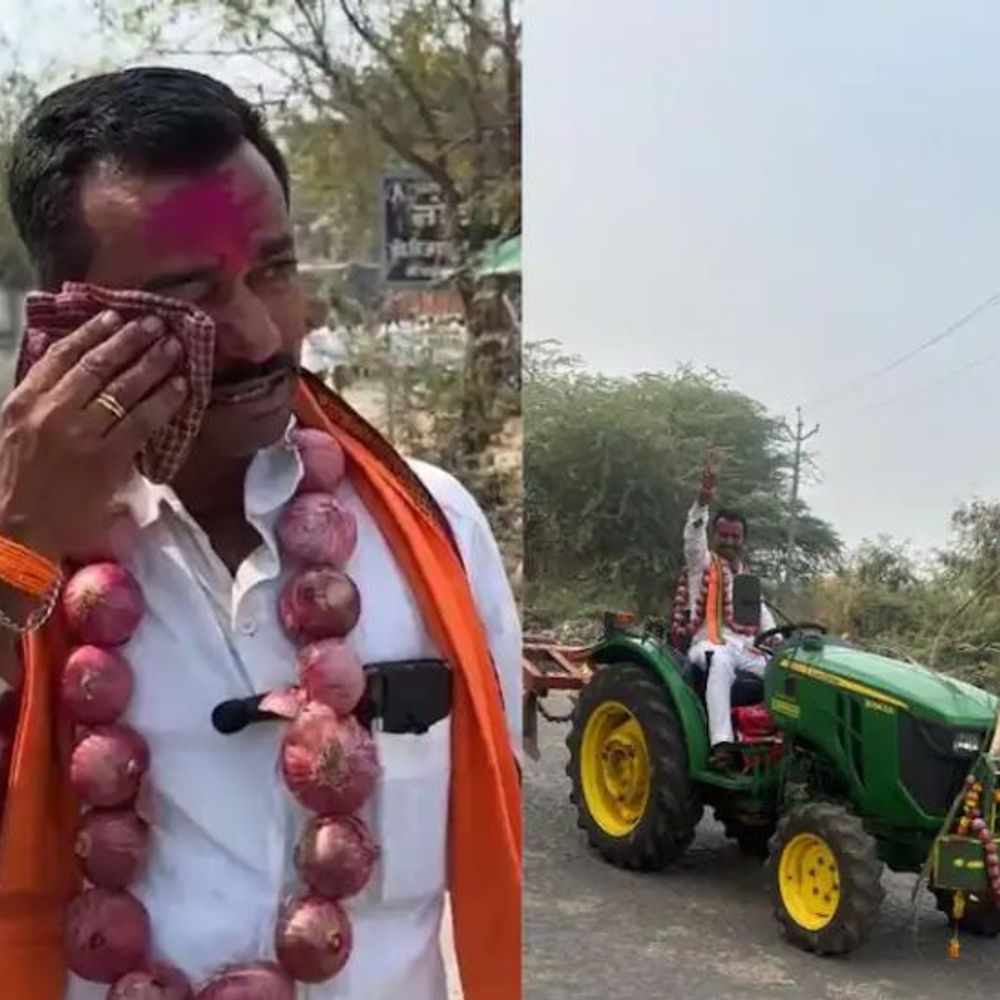 गळ्यात कांद्याची माळ, डोळ्यात अश्रू:माढ्यात शेतकरी पुत्राने अनोख्या पद्धतीने दाखल केला उमेदवारी अर्ज