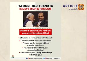 23 सप्टेंबर 2016 रोजी भारत सरकारने राफेल करारावर स्वाक्षरी केली. किंमत? सरकार आजही सांगत नाही. पण अंदाजे 59 हजार कोटी रुपये. या करारात ऑफसेट कलम होते 50 टक्के रक्कम डॉसलडन इ भारतात गुंतवणे बंधनकारक.फक्त 12 दिवसांनी, 3 ऑक्टोबर 2016 रोजी, राफेल निर्मात्या कंपनीने अनिल अंबानी यांच्या रिलायन्ससोबत रिलायन्स एरोस्पेस लिमिटेड स्थापन केली. एरोस्पेस क्षेत्रातील दशकानुदशके अनुभव असलेल्या HAL ला डावलून नवख्या फ़क्त 12 दिवसांच्या खासगी कंपनीला 30 हजार कोटींचा फायदा देण्यात आला. हा योगायोग आहे की सत्तेच्या आशीर्वादाने घडलेला सौदा?