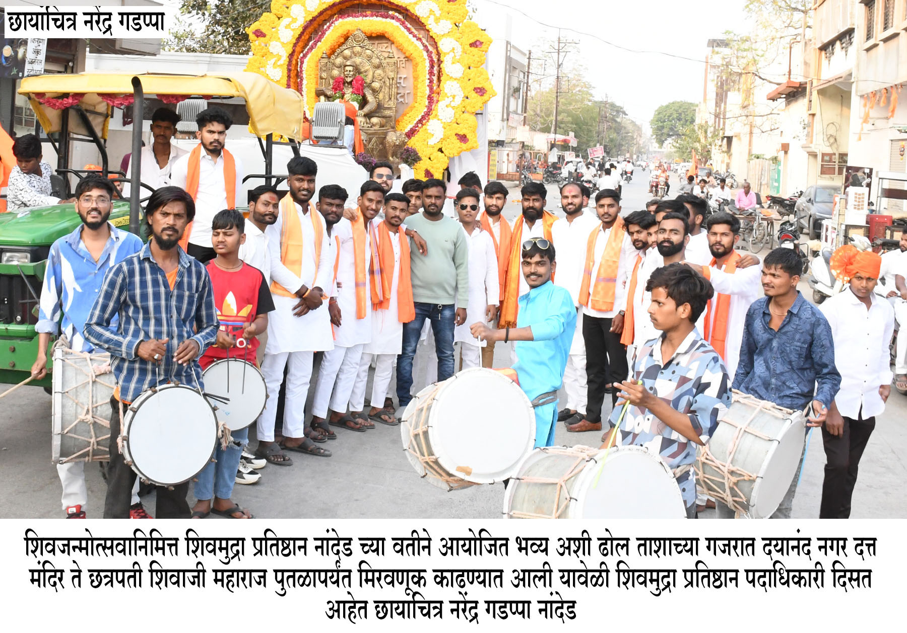 नांदेड शहरातील छत्रपती शिवाजी महाराज यांच्या पुतळ्यास पुष्पहार अर्पण करून अभिवादन करण्यात आले. यावेळी विविध सामाजिक संघटना, राजकीय पक्षांचे पदाधिकारी, शाळा–महाविद्यालयांचे विद्यार्थी व नागरिक मोठ्या संख्येने उपस्थित होते. ढोल-ताशांच्या गजरात आणि जयघोषात वातावरण शिवमय झाले होते.