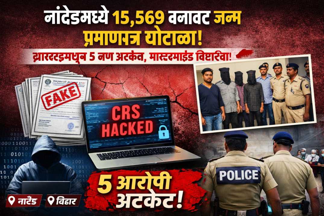 नांदेड (प्रतिनिधी) – डिजिटल प्रणालीचा गैरवापर करत नांदेड जिल्ह्यातील लोहा तालुक्यातील सावळेश्वर (लोकसंख्या सुमारे १५००) या गावाच्या नावावर तब्बल १५ हजार ५६९ बनावट जन्म नोंदणी प्रमाणपत्रे काढल्याचा धक्कादायक प्रकार उघडकीस आला आहे. या प्रकरणी नांदेड पोलिसांनी झारखंडमधून पाच आरोपींना अटक केली असून मुख्य सूत्रधार बिहारमधील असल्याचे तपासात समोर आले आहे. त्यासाठी पोलिसांचे विशेष पथक बिहारकडे रवाना झाले आहे.