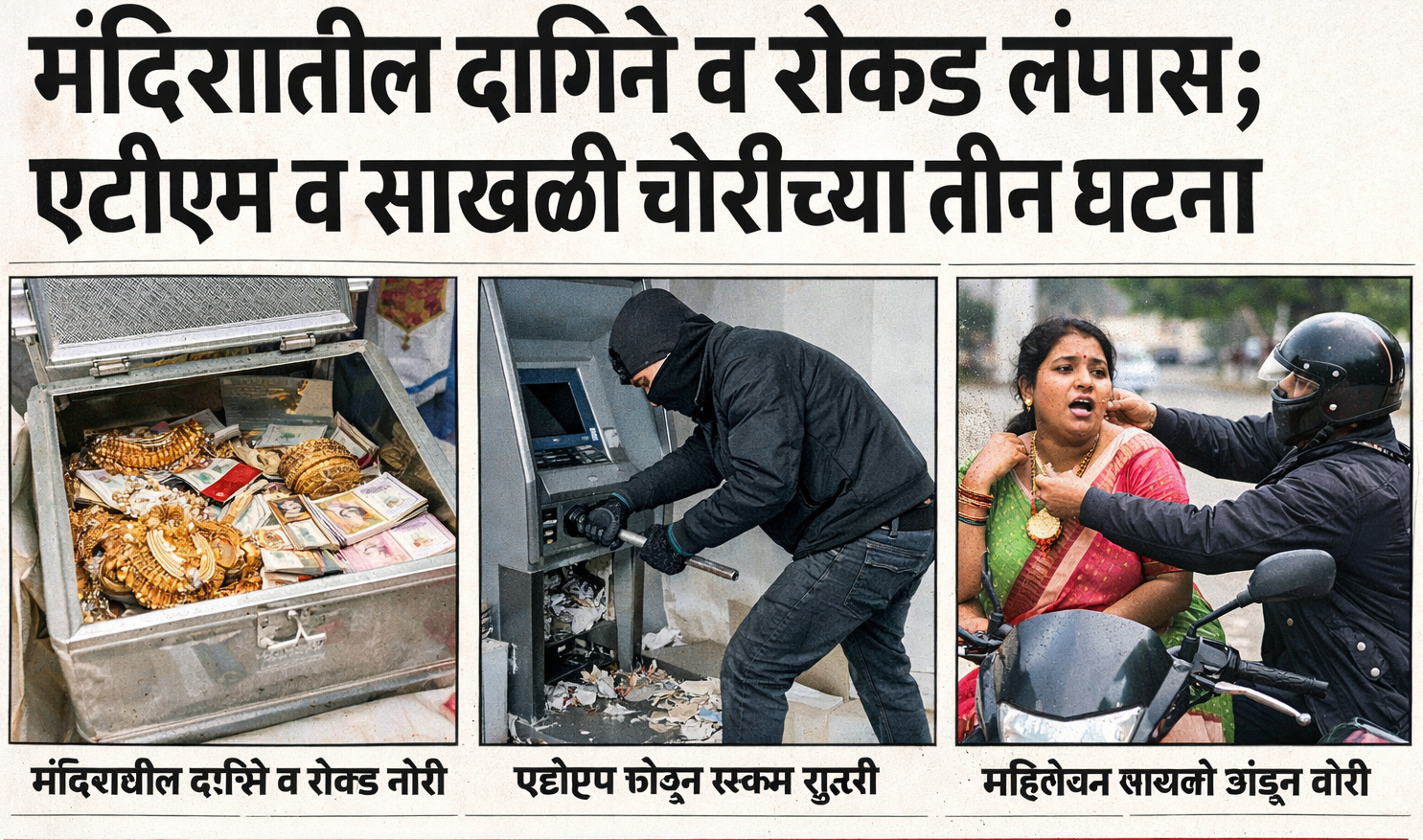 नायगाव तालुक्यातील विहूल रुक्मिणी मंदिरात चोरट्यांनी डल्ला मारला. २३ फेब्रुवारीच्या मध्यरात्री ते २४ फेब्रुवारी सकाळी ७ वाजेदरम्यान अज्ञात चोरट्याने मंदिराच्या चॅनल गेटच्या आतील दरवाजाचे कडेकोडे व कुलूप तोडून आत प्रवेश केला. चोरट्याने मंदिरातील दागिने व दानपेटीतील रोकड असा एकूण ९६,५०० रुपयांचा मुद्देमाल चोरून नेला. याप्रकरणी लक्ष्मण आनंदराव पांचाळ (वय ६३, रा. रातोळी) यांनी दिलेल्या फिर्यादीवरून पोलीस ठाणे नायगाव येथे गुन्हा दाखल करण्यात आला असून तपास सहायक पोलीस निरीक्षकपोमनाळकर करीत आहेत.