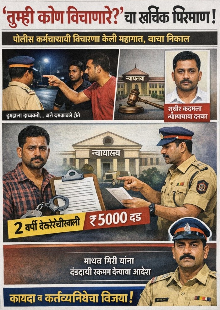 दोषी सुधीर कदम याला थेट तुरुंगात पाठविण्याऐवजी न्यायालयाने समाजसुधारणेचा मार्ग अवलंबला. न्यायाधीश सोलंकर यांनी त्याला दोन वर्षे पर्यवेक्षण अधिकाऱ्याच्या देखरेखीखाली राहण्याचे आदेश दिले आहेत. या कालावधीत त्याने कोणताही अनुचित प्रकार केल्यास त्याला थेट शिक्षा भोगावी लागू शकते. याशिवाय, पाच हजार रुपयांचा दंडही ठोठावण्यात आला असून ही रक्कम फिर्यादी पोलीस कर्मचारी माधव नारायण गिरी यांना देण्याचे आदेश न्यायालयाने दिले आहेत.