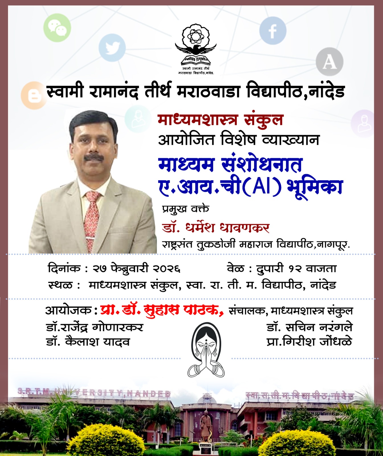 सध्याच्या डिजिटल युगात पत्रकारिता, जाहिरात आणि जनसंपर्क क्षेत्रात एआयचा (AI) वापर अपरिहार्य झाला आहे. याच पार्श्वभूमीवर, विद्यार्थ्यांच्या ज्ञानात भर टाकण्यासाठी आणि तंत्रज्ञानाचे नवे दालन उलगडण्यासाठी येत्या २७ फेब्रुवारी २०२६ रोजी हे वैचारिक सत्र संपन्न होणार आहे. माध्यम क्षेत्रातील वाढता तंत्रज्ञानाचा प्रभाव आणि कृत्रिम बुद्धिमत्तेचा संशोधनातील वापर यावर डॉ. धावणकर आपले विचार मांडतील.