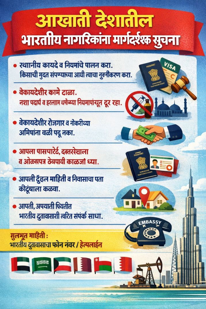 मुंबई – इराण-इस्रायल युद्धाच्या पार्श्वभूमीवर, संयुक्त अरब अमिराती (यूएई) मधील सर्व भारतीय नागरिकांना विनाकारण प्रवास टाळण्याचा, आवश्यक ती काळजी घेण्याचा, सतर्क राहण्याचा तसेच यूएईच्या अधिकाऱ्यांकडून आणि दूतावासाकडून वेळोवेळी जारी करण्यात येणाऱ्या सुरक्षा मार्गदर्शक सूचना व सल्ल्यांचे पालन करण्याचा सल्ला देण्यात आला आहे.