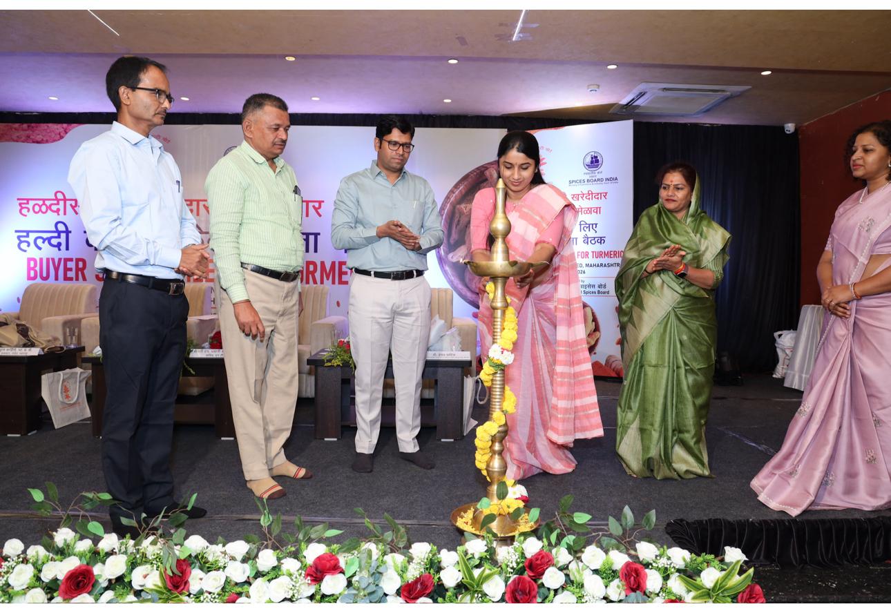 हळद क्षेत्रातील व्यापार संधी वाढविणे आणि बाजारपेठेतील दुवे मजबूत करण्याच्या उद्देशाने राष्ट्रीय हळद बोर्डाच्यावतीने, स्पायसेस बोर्ड इंडिया यांच्या सहकार्याने आज नांदेड येथील VITS हॉटेलमध्ये हळद विषयक खरेदीदार–विक्रेता मेळाव्याचे आयोजन करण्यात आले होते. या मेळाव्यात महाराष्ट्रातील हळद उत्पादक शेतकरी, शेतकरी उत्पादक कंपन्या, देशभरातील निर्यातदार, उद्योग प्रतिनिधी तसेच विविध शासकीय विभागांचे अधिकारी सहभागी झाले. या कार्यक्रमाला जिल्हाधिकारी राहुल कर्डिले  हे प्रमुख पाहुणे म्हणून उपस्थित होते. कार्यक्रमाचे उद्घाटन राष्ट्रीय हळद बोर्डाच्या सचिव सौ. एन. भवानीश्री यांच्या उपस्थितीत झाले. वसंतराव नाईक मराठवाडा कृषी विद्यापीठ परभणीचे सहयोगी अधिष्ठाता डॉ. शिवाजीराव शिंदे तसेच मा. बाळासाहेब ठाकरे हरिद्रा संशोधन व प्रशिक्षण केंद्र हिंगोली येथील प्रतिनिधी म्हणून उपस्थित होते. जिल्हाधिकारी राहुल कर्डीले यांनी हळद मूल्य साखळी मजबूत करण्यासाठी शेतकरी, संस्था आणि निर्यातदार यांच्या समन्वयित प्रयत्नांचे महत्त्व स्पष्ट केले. “खरेदीदार–विक्रेता मेळावे हे शेतकऱ्यांना थेट बाजारपेठेशी जोडण्याचे प्रभावी व्यासपीठ असून मूल्यवर्धन व चांगला दर मिळविण्यासाठी नवी संधी निर्माण करतात, असेही त्यांनी सांगितले.
