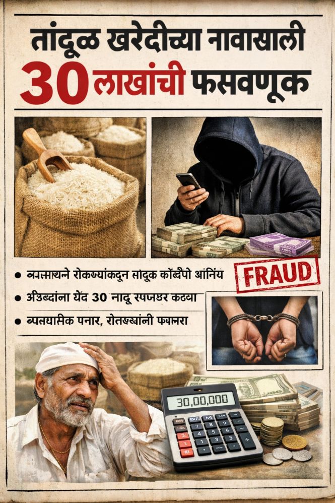 पोलीसांनी दिलेल्या माहितीनुसार, दिनांक 24 फेब्रुवारी 2026 ते 28 फेब्रुवारी 2026 दरम्यान ज्ञानेश्वर नगर येथील फिर्यादीच्या ट्रेडिंग कंपनी, सिडको नांदेड येथे हा प्रकार घडला. आरोपी फरीद भैया (रा. लखनौ, उत्तर प्रदेश), रघुनंदन गोंडा (रा. उत्तर प्रदेश) व आलोक खरे (रा. उत्तर प्रदेश) यांनी संगनमत करून फिर्यादीकडून तांदूळ होलसेल खरेदी करण्याच्या बहाण्याने बँक ऑफ बडोदा खात्यावर 20 लाख रुपये पाठवले. त्यानंतर आणखी पैसे पाठवण्याची मागणी करत फिर्यादीकडून पुन्हा 10 लाख रुपये मागवून घेतले. मात्र त्यानंतर आरोपींनी तांदूळ न देता तसेच घेतलेली रक्कम परत न करता फिर्यादीची फसवणूक केली. याप्रकरणी फिर्यादी सोमनाथ दिनकर मिसाळ (वय 30, रा. पांगरा, ता. आटी, जि. बीड) यांनी दिलेल्या फिर्यादीवरून नांदेड ग्रामीण पोलीस ठाण्यात गुन्हा क्रमांक 240/2026 अंतर्गत भारतीय दंड संहिता कलम 316(2), 3(5) तसेच बीएनएस-2023 अन्वये गुन्हा दाखल करण्यात आला आहे. या प्रकरणाचा पुढील तपास पोहेकॉ/486 तेलंगे हे करीत आहेत.