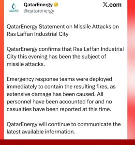 कतारच्या गॅस संयंत्रावर झालेल्या हल्ल्यामुळे पुढील पाच वर्षांसाठी तब्बल 17% उत्पादन घटण्याची शक्यता व्यक्त केली जात आहे ही केवळ स्थानिक नाही, तर जागतिक ऊर्जासंकटाची घंटा आहे.कारण आज झालेले नुकसान भरून पुन्हा आपले उत्पादन 17%  टक्के वाढवण्यासाठी कतर  5  वर्ष लागणार आहेत.