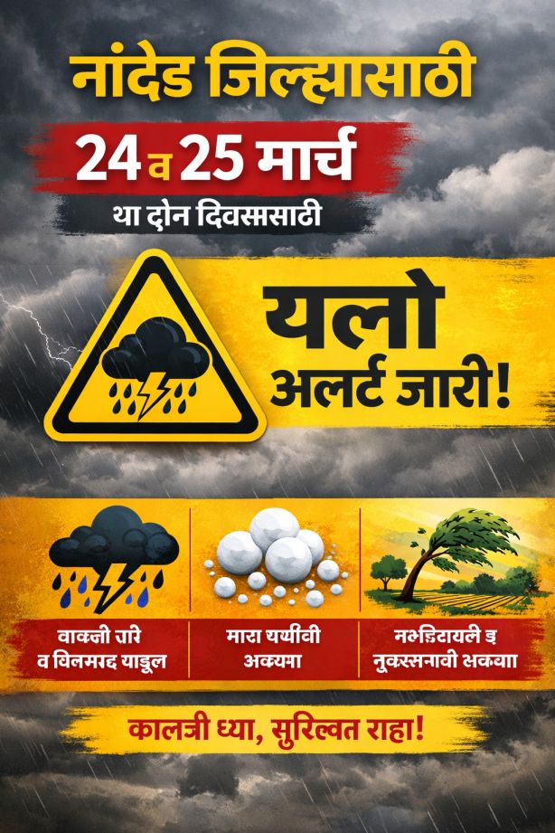 नांदेड -प्रादेशिक हवामानशास्त्र केंद्र, मुंबई यांनी दिनांक 24 मार्च रोजी दिलेल्या सूचनेनुसार नांदेड जिल्ह्यासाठी दिनांक 24 व 25 मार्च 2026 या दोन दिवसांसाठी यलो अलर्ट जारी केलेला आहे. दिनांक 24 व 25 मार्च 2026 हे दोन दिवस जिल्ह्यात तुरळक ठिकाणी ताशी 40 ते 50 किमी वेगाने वादळी वारे वाहण्याची, विजेच्या कडकडाटासह व ढगांच्या गडगडाटासह मध्यम स्वरूपाचा पाऊस पडण्याची अधिक शक्यता वर्तविली आहे. या नैसर्गिक आपत्ती संदर्भात सर्व संबंधित यंत्रणा आणि नागरिकांनी खबरदारी घ्यावी असे आवाहन जिल्हा प्रशासनाने केले आहे.