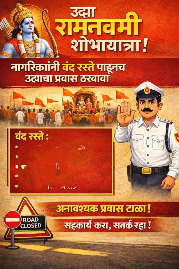 नांदेड (प्रतिनिधी)- श्री रामनवमी जन्मोत्सवानिमित्त २६ मार्च २०२६ रोजी नांदेड शहरात भव्य शोभायात्रा काढण्यात येणार असून, या पार्श्वभूमीवर शहरातील वाहतूक व्यवस्थेत तात्पुरते बदल करण्यात आले आहेत. शांतता व सुव्यवस्था अबाधित राखण्यासाठी पोलीस प्रशासनाने महाराष्ट्र पोलीस अधिनियम १९५१ च्या कलम ३६ अंतर्गत अधिसूचना जारी केली आहे.