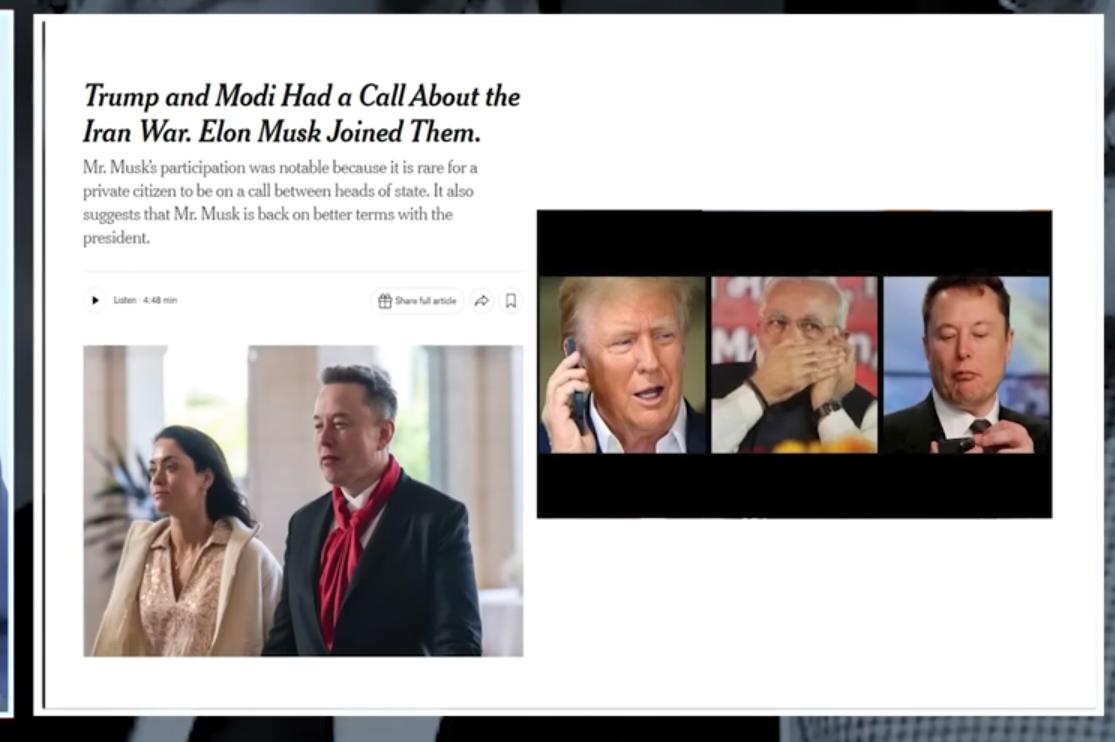 या वृत्तानुसार भारताचे पंतप्रधान नरेंद्र मोदी आणि अमेरिकेचे माजी राष्ट्राध्यक्ष डोनाल्ड ट्रम्प यांच्यात फोनवर चर्चा झाली. मात्र धक्कादायक बाब म्हणजे या चर्चेत केवळ दोन नेतेच नव्हते, तर जगातील सर्वात श्रीमंत उद्योजकांपैकी एक मस्क  यांचाही सहभाग असल्याचा दावा बातमीत करण्यात आला आहे.मार्च महिन्यात झालेल्या या संभाषणाबद्दल पंतप्रधान मोदी यांनी ट्विट केले होते. परंतु त्या ट्विटमध्ये एलॉन मस्क यांच्या सहभागाचा कुठेही उल्लेख नव्हता. महत्त्वाच्या विषयांवर प्राथमिक चर्चा झाली,एवढाच मर्यादित उल्लेख करण्यात आला. मग प्रश्न उभा राहतो  जर चर्चा पारदर्शक होती, तर तिसऱ्या व्यक्तीचे नाव का लपवले गेले?