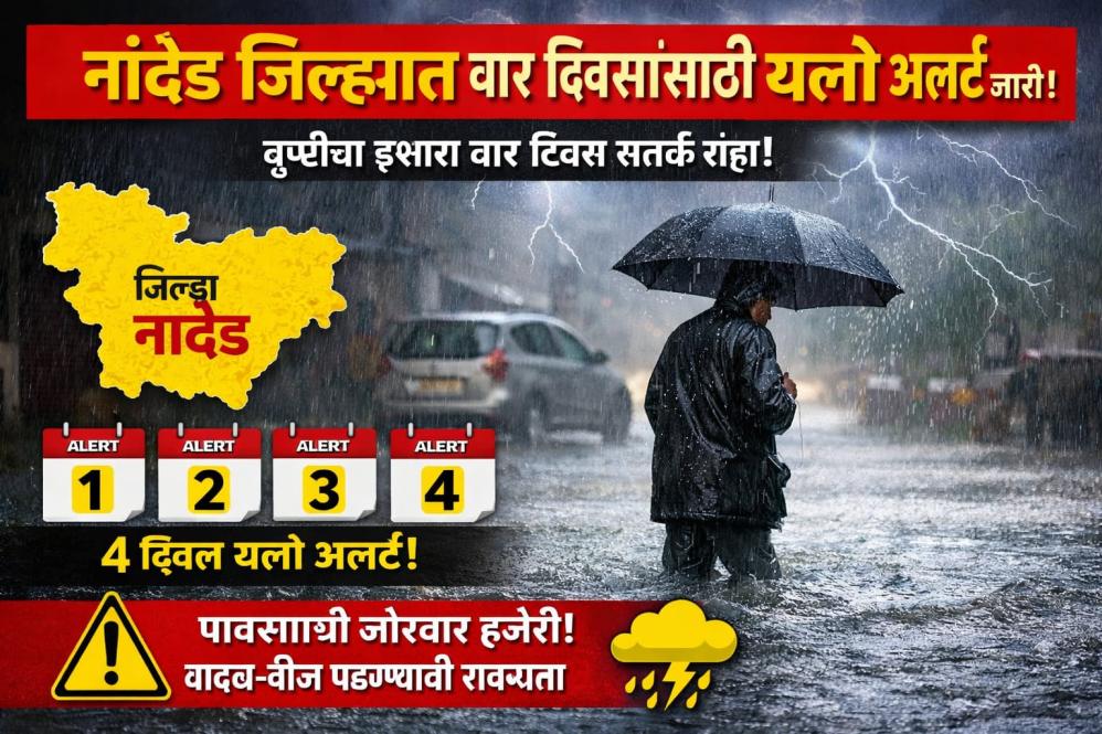 नांदेड – प्रादेशिक हवामानशास्त्र केंद्र, मुंबई यांनी 30 मार्च रोजी दिलेल्या सूचनेनुसार नांदेड जिल्ह्यासाठी 30 व 31 मार्च 2026 तसेच 1 व 3 एप्रिल 2026 या दोन दिवसांसाठी यलो अलर्ट जारी केलेला आहे. हे चार दिवस जिल्ह्यात तुरळक ठिकाणी ताशी 40 ते 50 किमी वेगाने वादळी वारे वाहण्याची, विजेच्या कडकडाटासह व ढगांच्या गडगडाटासह मध्यम स्वरूपाचा पाऊस पडण्याची अधिक शक्यता वर्तविली आहे. या नैसर्गिक आपत्ती संदर्भात सर्व संबंधित यंत्रणा आणि नागरिकांनी खबरदारी घ्यावी असे आवाहन जिल्हा प्रशासनाच्यावतीने करण्यात आले आहे.