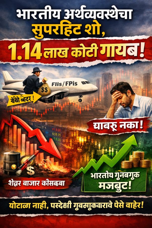 भारतीय अर्थव्यवस्थेची अशी पोस्टमार्टम रिपोर्ट सादर करता येईल की जणू शेअर बाजार हा रुग्ण आयसीयूमध्ये आहे आणि डॉक्टर अजूनही म्हणत आहेत काळजी करू नका, सर्व काही नियंत्रणात आहे! उभा मार्च अखेर भारतातून विदेशी गुंतवणूकदारांचा नमस्कार करून प्रस्थान केले आहे.भारतीय शेअर बाजारात परदेशी गुंतवणूकदारांनी इतक्या वेगाने पैसा काढला की जणू लग्नाच्या जेवणात फक्त सेल्फी घेऊन लोक निघून गेले. मार्च महिन्यात तब्बल १.१४ लाख कोटी रुपये बाहेर गेले  म्हणजे बाजारातला उत्साह WhatsApp स्टेटससारखा २४ तासांत गायब!